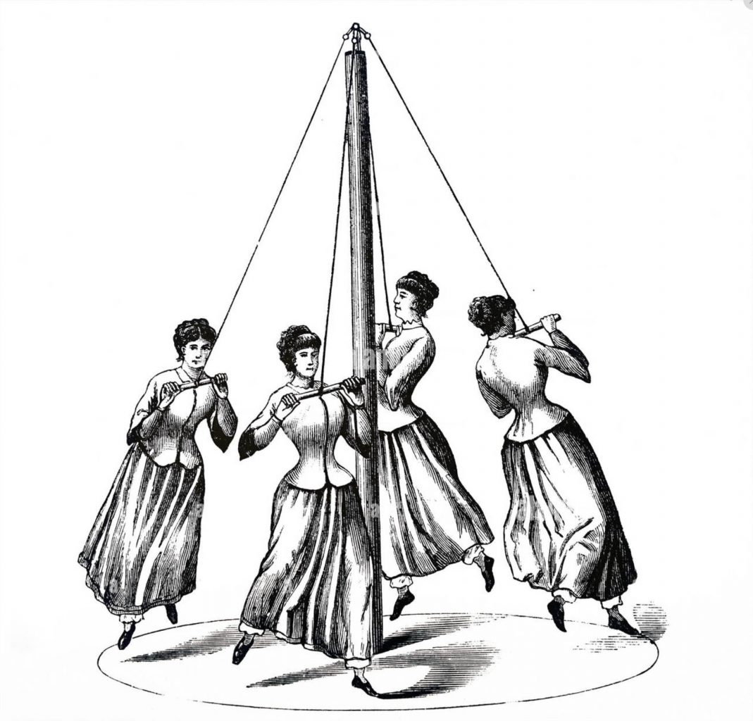 In the foreground, four girls are showing of the Rundlauf. The word means “run around” in German. The Rundlauf was first mentioned in the book, “Die weibliche Turnschule” (The Female Gymnastics School), published in 1875. At first it was used as an exercise for women, and included routines with marching, hopping and running.