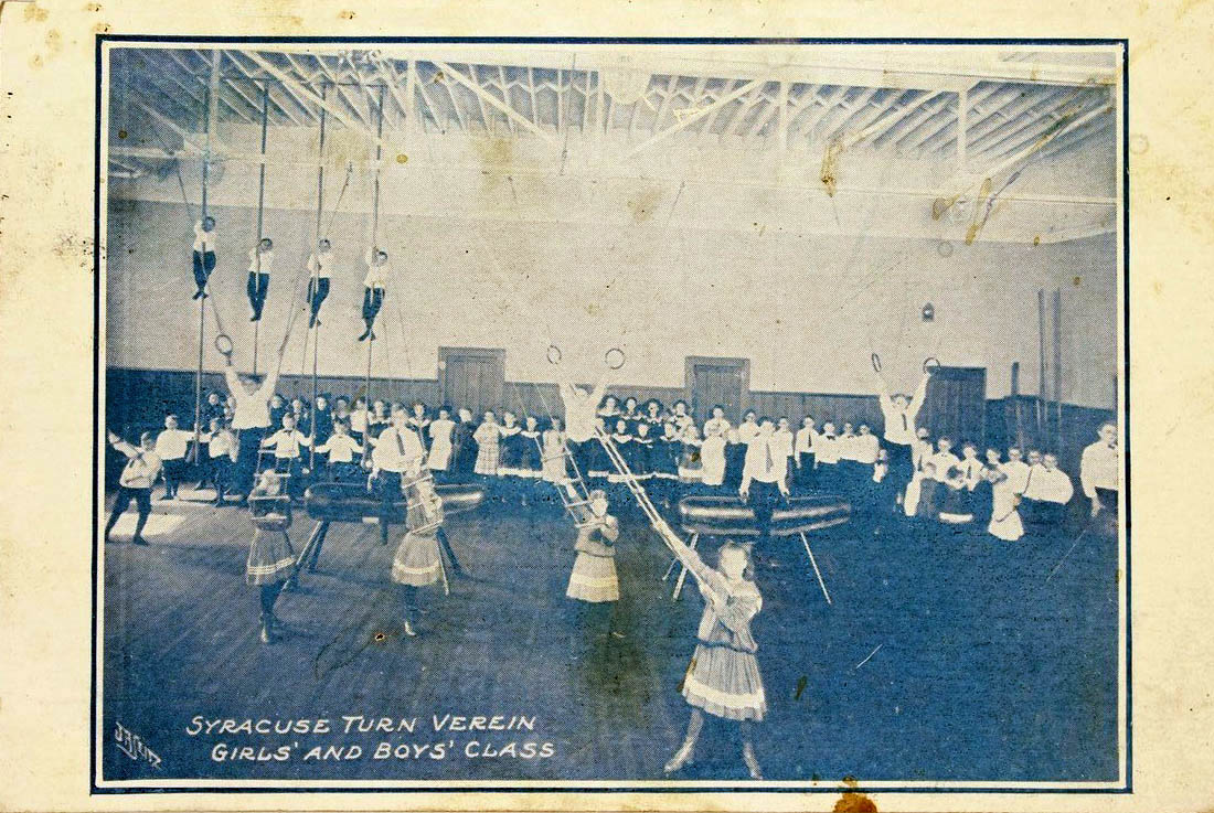 The Syracuse Turners offered classes for boys and girls. This 1910 postcard shows some of the classic exercise equipment, including the tall climbing poles, the pommel horses, and several students hold light weights.