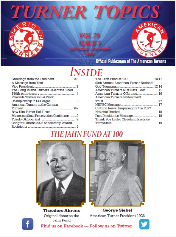 Turner Topics, published since 1936, is the newsletter of the American Turners. The newsletter contains articles about Turner history and philosophy, obituaries of Turner members, and reports on the activities of the national organization, of individual Turner societies, and of related German-American organizations. We invite submission of news and articles. Please send to Craig Sniezek, Editor, 1440 Crestwood Drive, Aurora, IL, 60506, or via email to topicseditor@amturners.org.